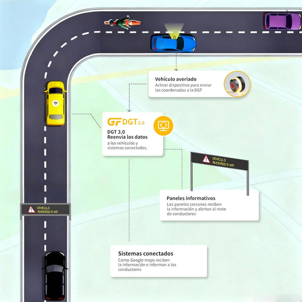 📜 Homologación DGT + Adaptación a Normativa 2025:Validado oficialmente por la Dirección General de Tráfico (DGT) española, es la alternativa cumplida a los triángulos de emergencia y luces no homologadas que dejarán de ser válidos a partir del 31 de diciembre de 2025. Equipado con tecnología estándar V16, se adapta perfectamente a las últimas normativas de seguridad vial, brindando protección legal para situaciones de emergencia vehicular